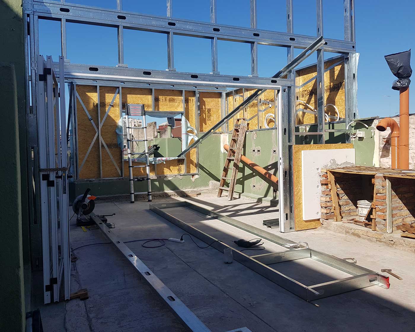 En la obra de Cochabamba, se enfrentó la necesidad de crear un espacio de quincho en la terraza, y tras un exhaustivo análisis estructural de la vivienda, se decidió optar por una construcción puramente de Steel Frame, es decir, una construcción en seco.