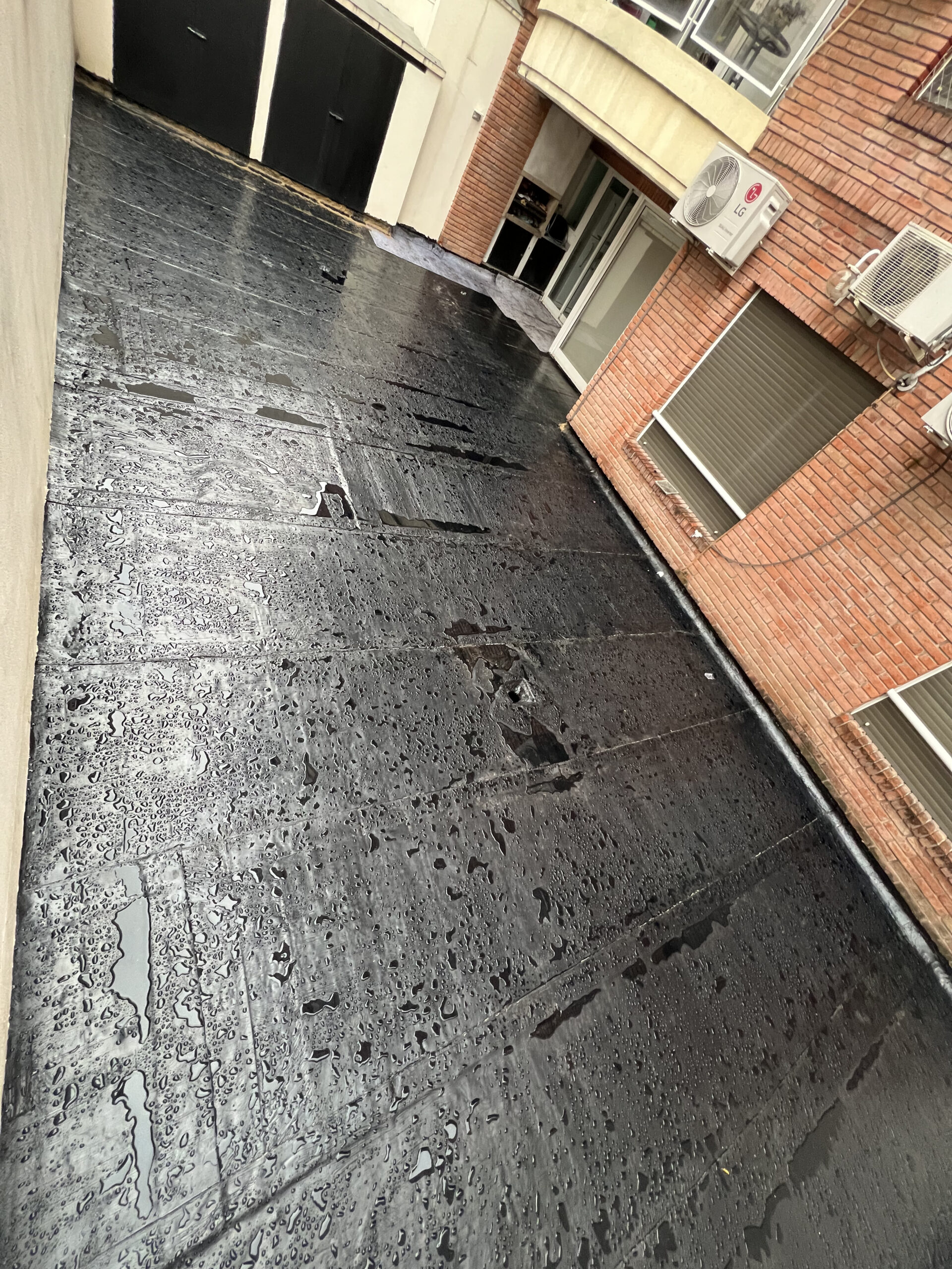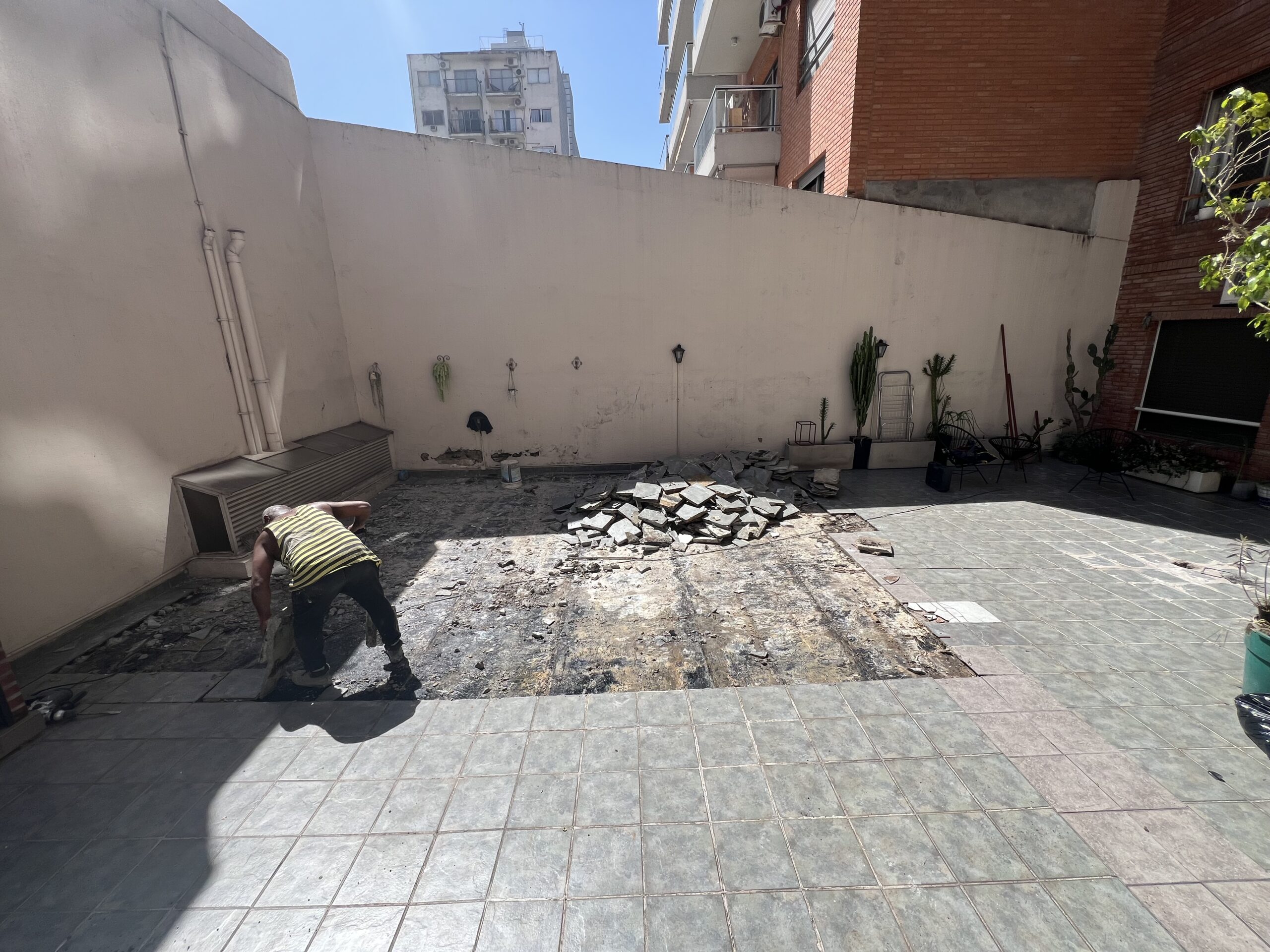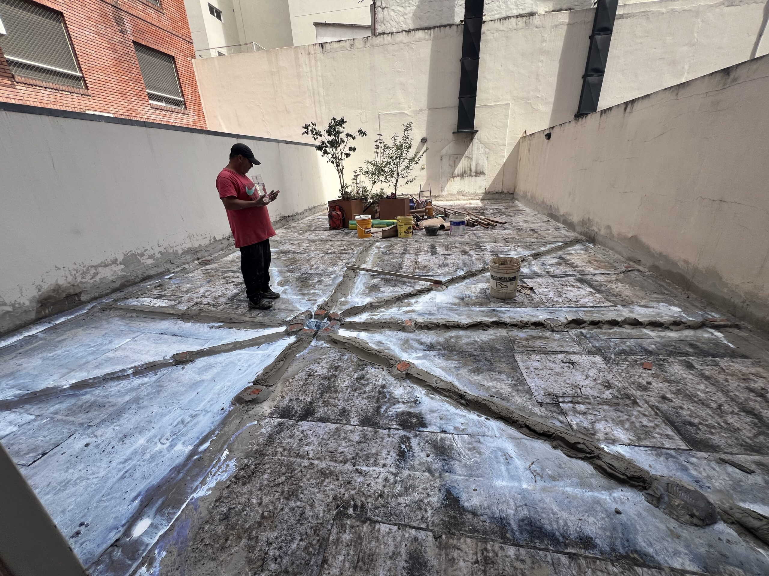 Durante los trabajos, al retirar la superficie asfáltica, se constató su deterioro avanzado, lo que requería una solución estructural en lugar de una simple reparación superficial. Además, se detectaron desprendimientos en la carpeta y cerámicos rotos en distintos sectores, consecuencia de la falta de juntas de dilatación. A esto se sumaba una ejecución deficiente de las babetas, lo que había contribuido al desgaste general del sistema de impermeabilización.