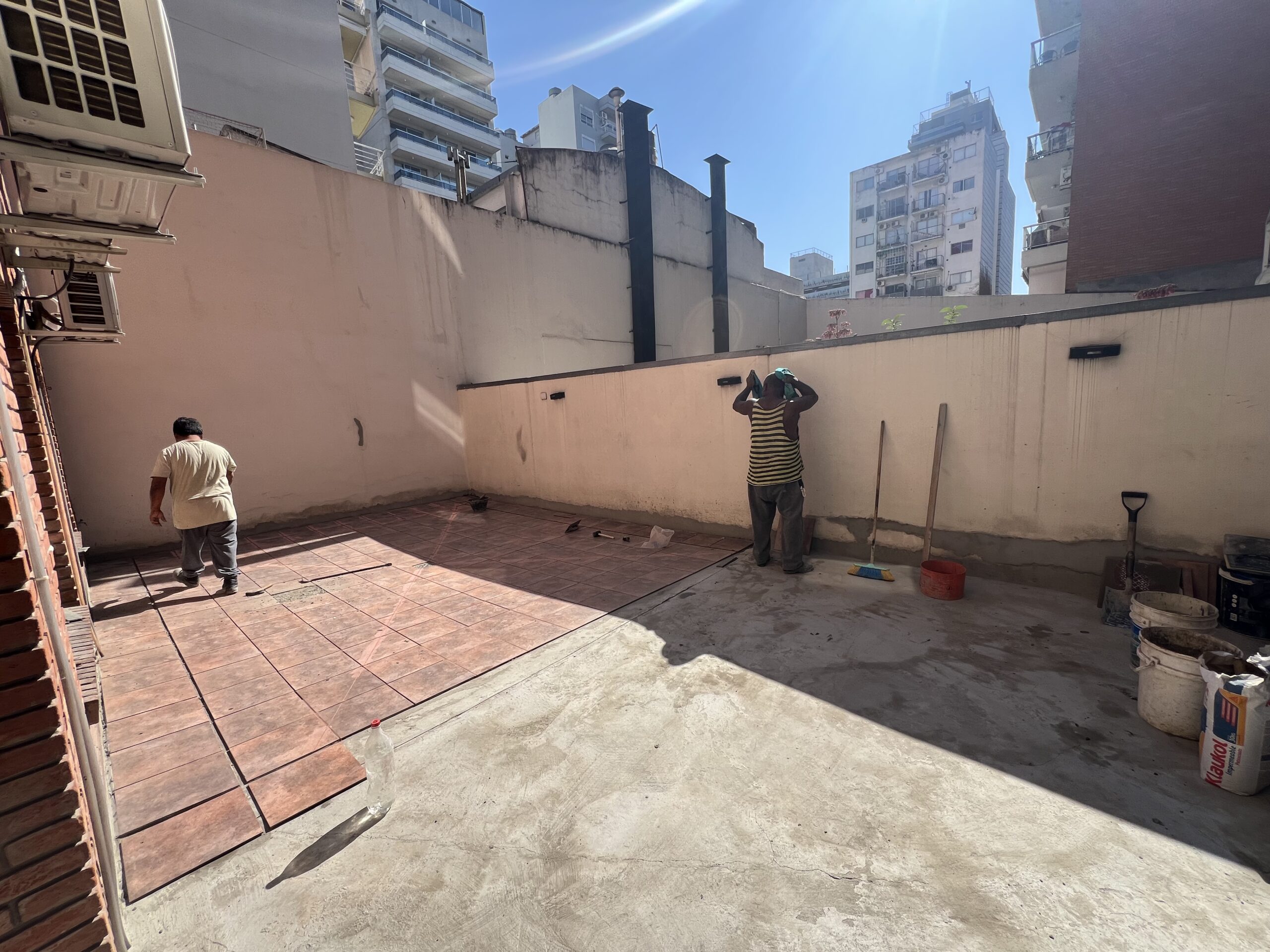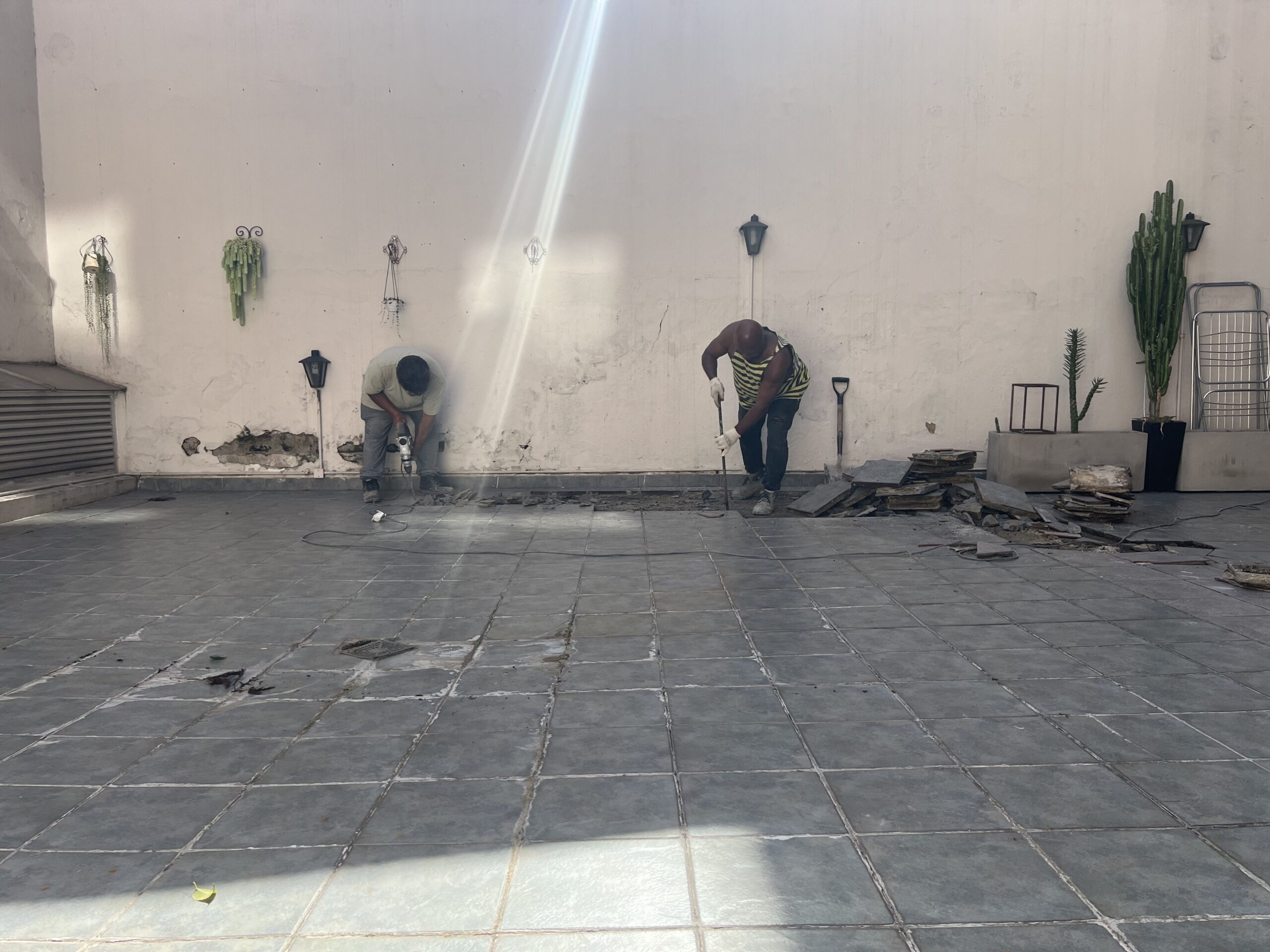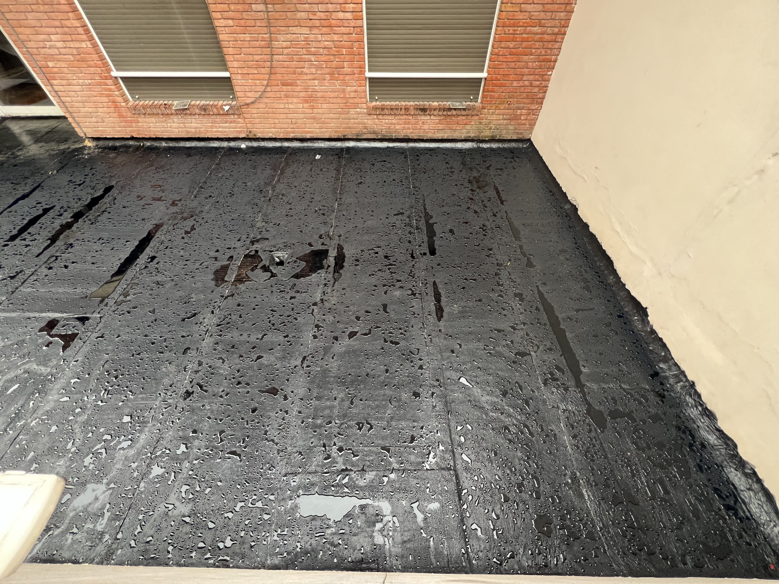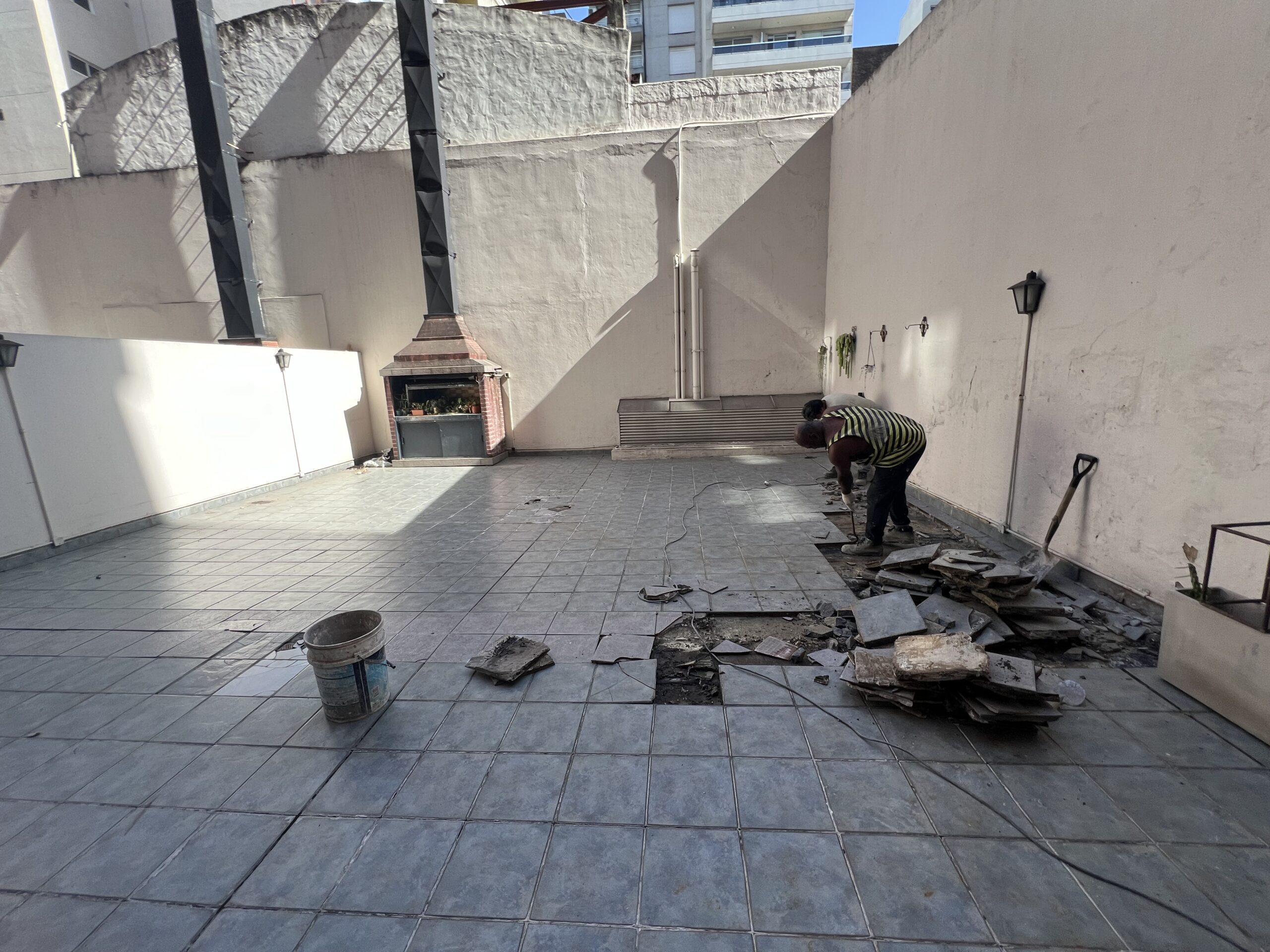 Durante los trabajos, al retirar la superficie asfáltica, se constató su deterioro avanzado, lo que requería una solución estructural en lugar de una simple reparación superficial. Además, se detectaron desprendimientos en la carpeta y cerámicos rotos en distintos sectores, consecuencia de la falta de juntas de dilatación. A esto se sumaba una ejecución deficiente de las babetas, lo que había contribuido al desgaste general del sistema de impermeabilización.
