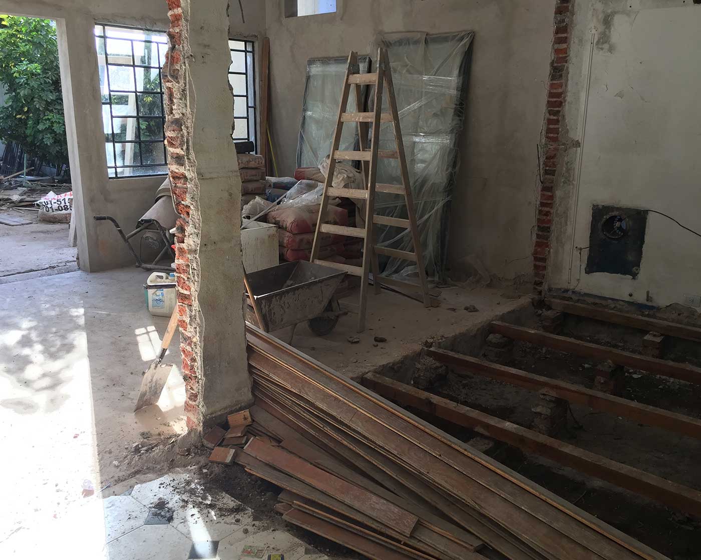 – Proyecto arquitectónico: Se inició con la proyección y construcción de la vivienda desde sus cimientos, implicando la demolición de gran parte de la estructura existente. El diseño se enfocó en satisfacer las necesidades de los clientes, teniendo en cuenta especialmente las visitas de sus hijos que requerían hospedarse por varios días. La planta baja se diseñó para cubrir todas las necesidades cotidianas, dejando la planta alta para el dormitorio de los clientes, un estudio privado y los servicios necesarios. Además, se instaló un sistema de calefacción centralizada con radiadores en todos los espacios.
